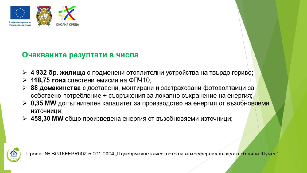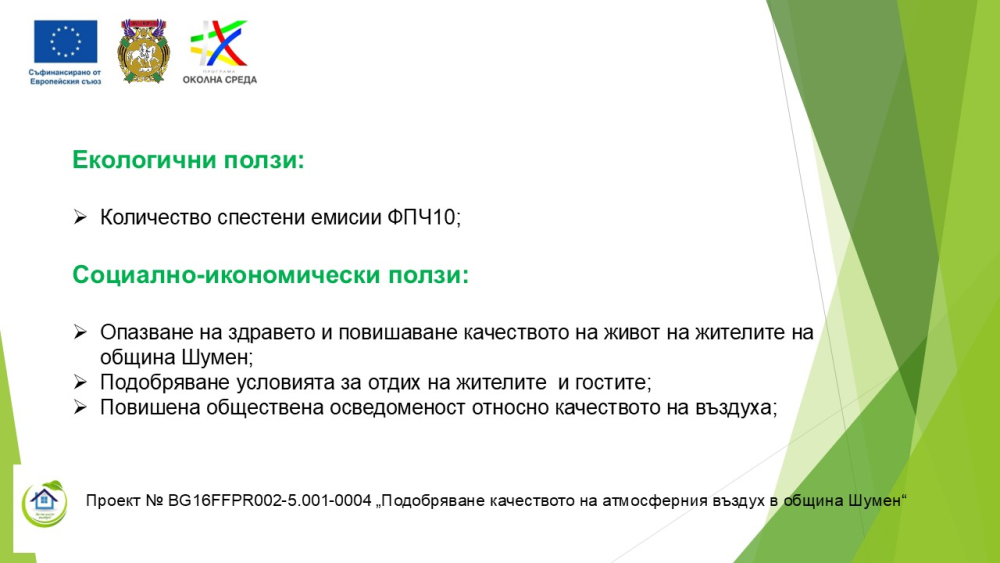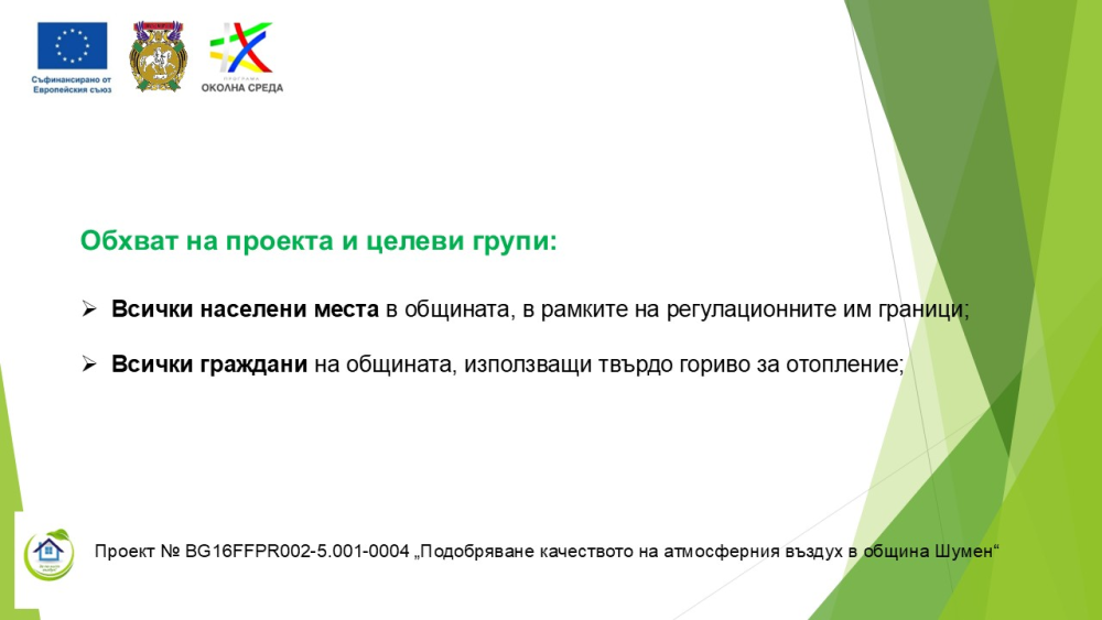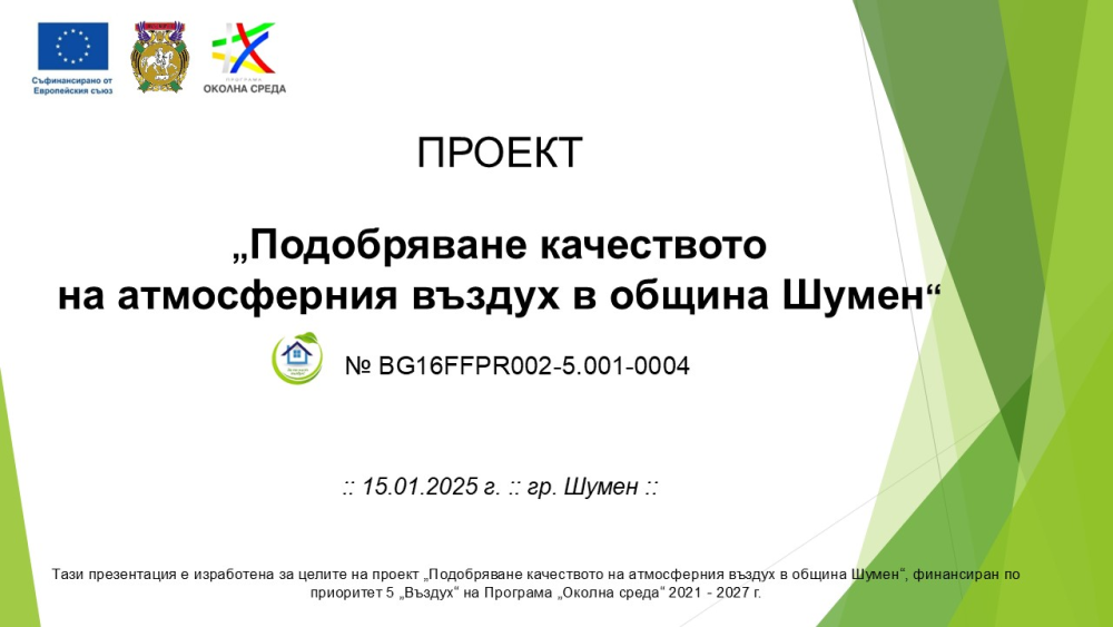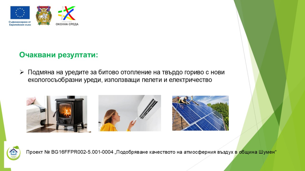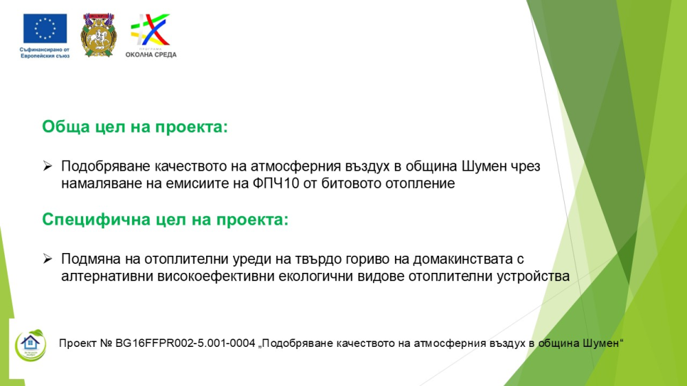 Обща цел на проекта: Да се подобри качеството на атмосферния въздух в община Шумен чрез намаляване на емисиите на ФПЧ10 от битовото отопление, като един от основните източници на замърсяване на въздуха.