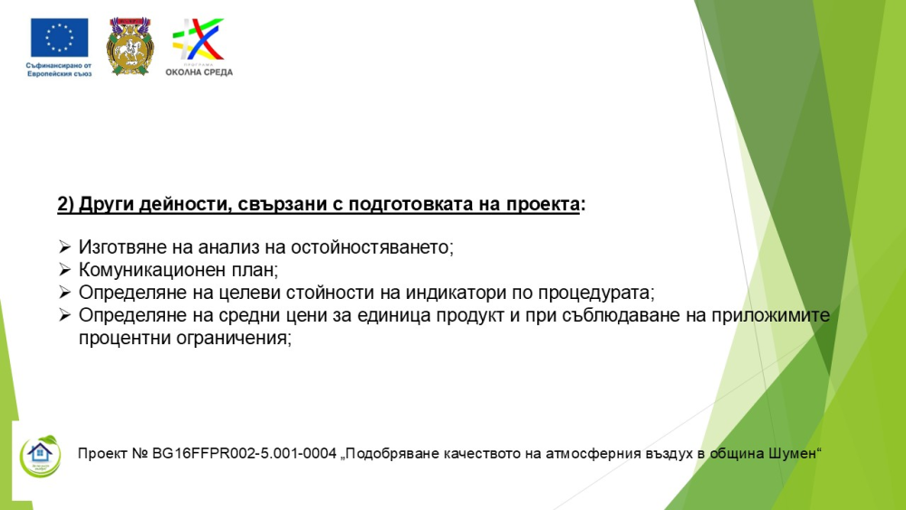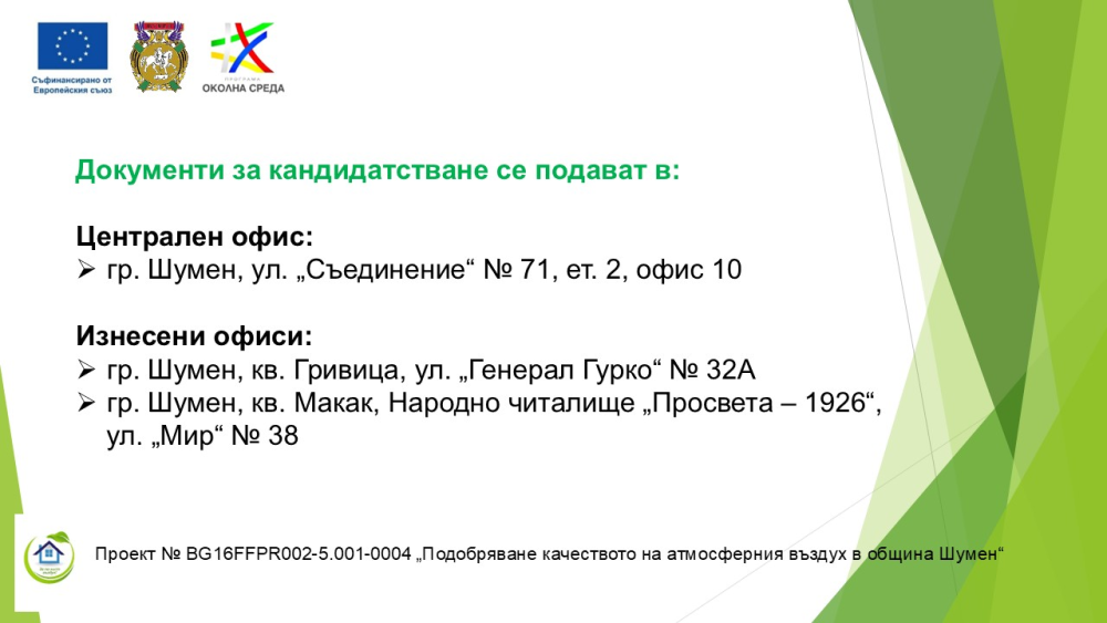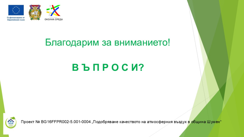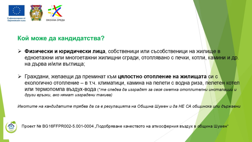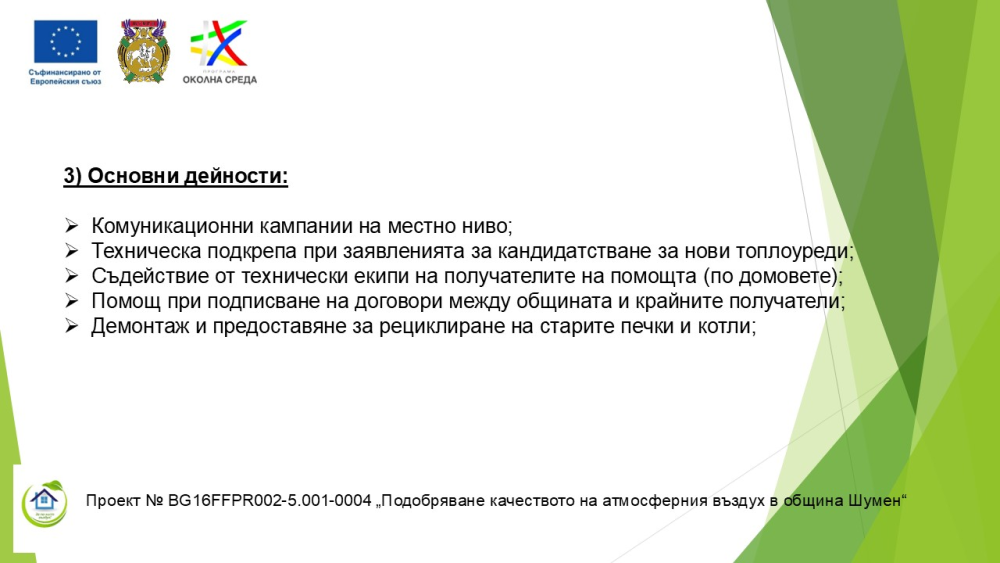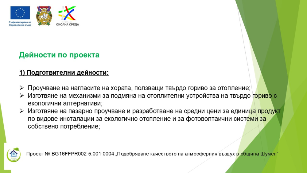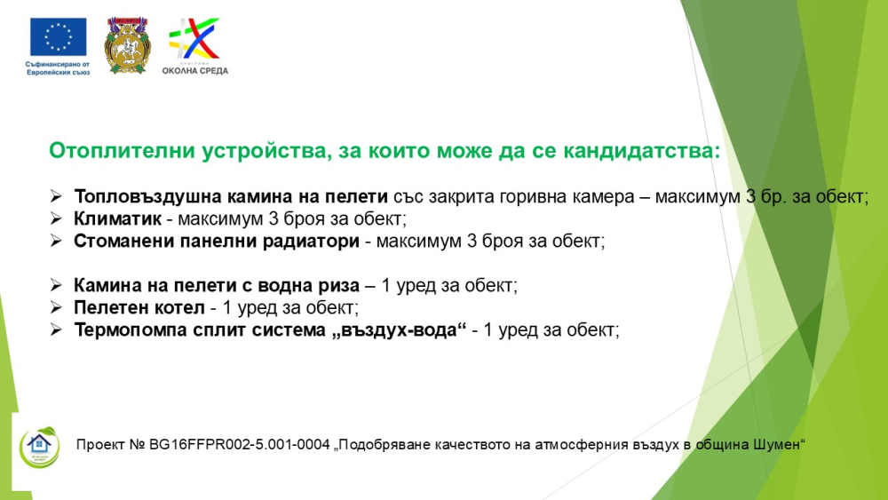 Обща цел на проекта: Да се подобри качеството на атмосферния въздух в община Шумен чрез намаляване на емисиите на ФПЧ10 от битовото отопление, като един от основните източници на замърсяване на въздуха.