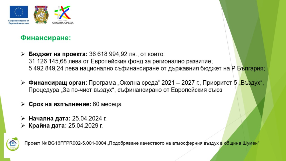 Период за изпълнение на проекта: 60 месеца, считано от датата на сключването на договора за финансиране, но не по-късно от 31.12.2029 г.